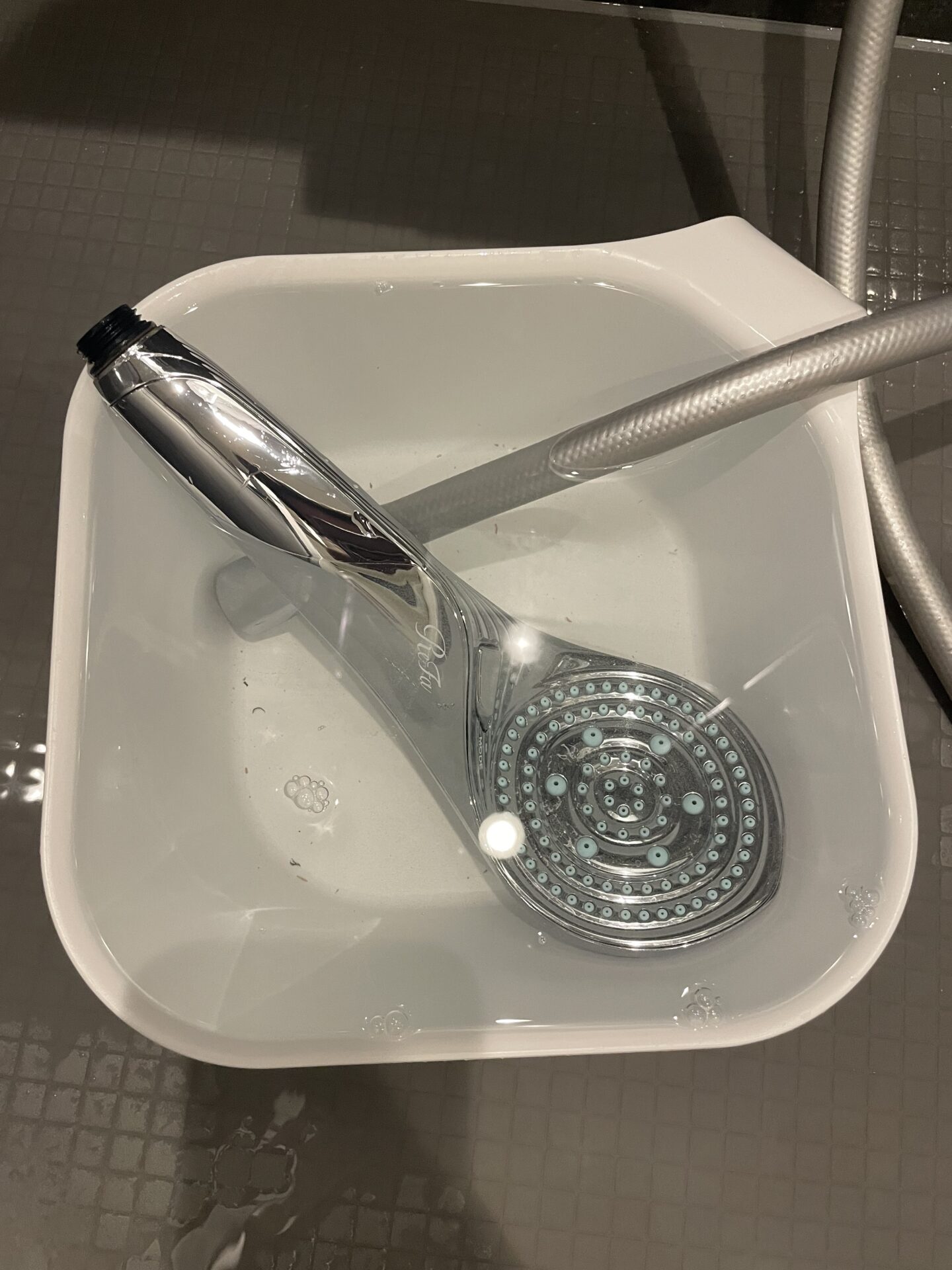 さっそく、洗面器にお湯をはってクエン酸を溶かし、シャワーヘッドをドボン!
